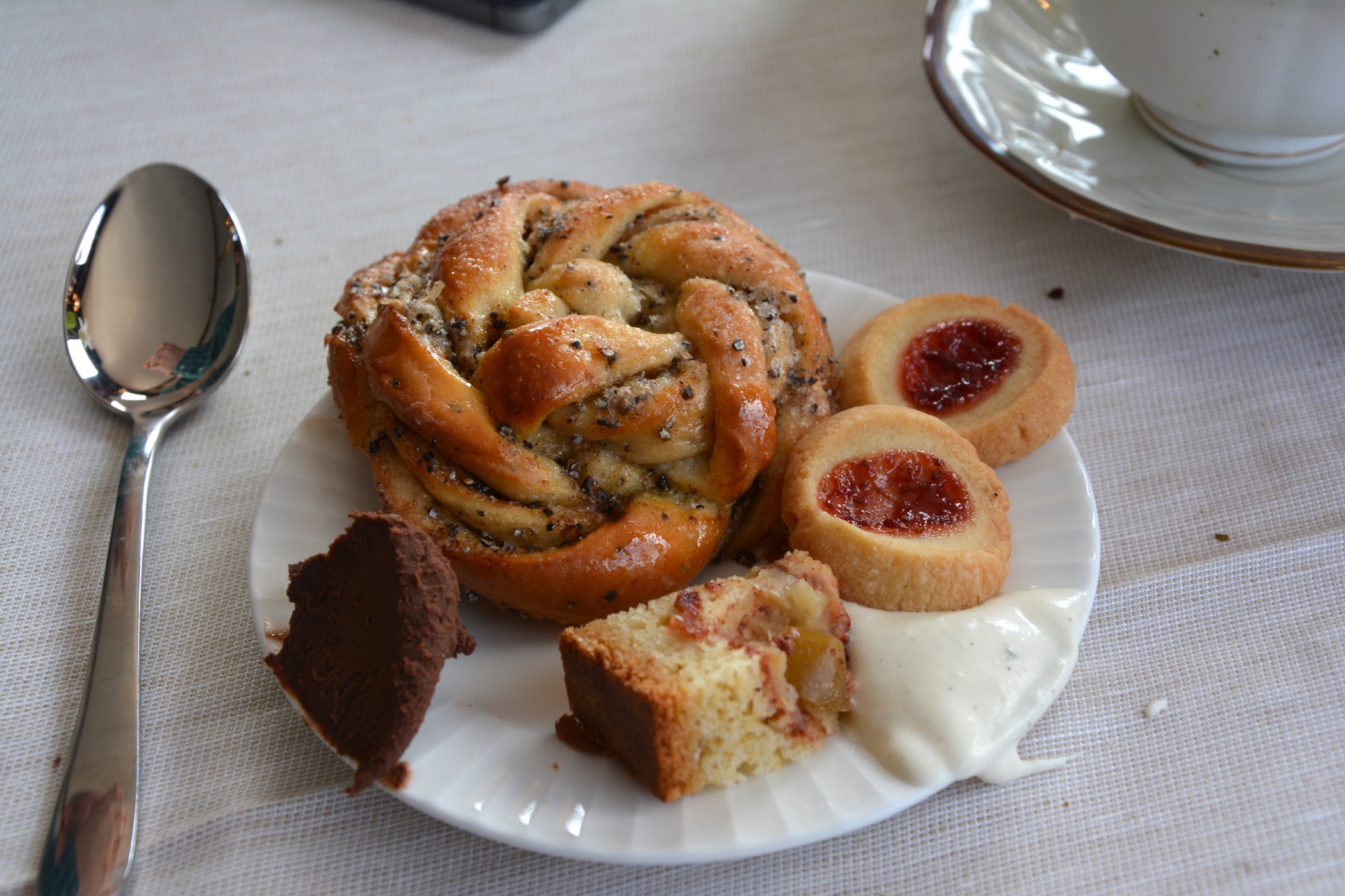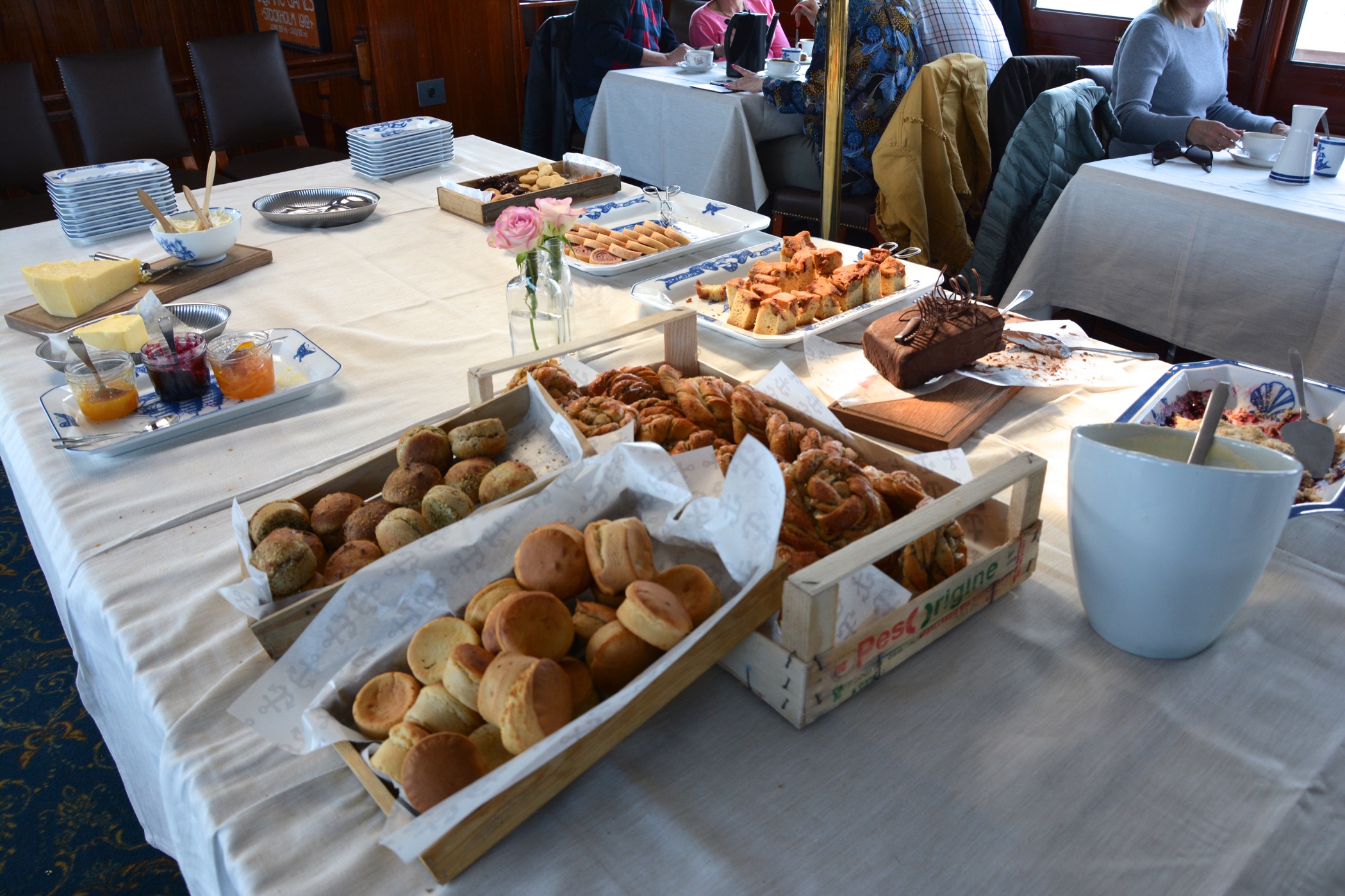 Sedan var det bara att gå och ta för sig av buffén. Det fanns två sorters scones, smör, färskost, marmelader, ost, småkakor, chokladkaka, äppelpaj, smulpaj och kardemummabullar. Scones med tillbehör var verkligen färska och mycket goda. Jag älskar ju scones och åt fyra stycken!!! Sedan tog vi för av oss av desserterna. Jag som är ett stort fan av bullar tyckte den var godast även om allt höll hög klass. Kaffe och te serverades vid bordet och de som ville kunde beställa in mer dryck.