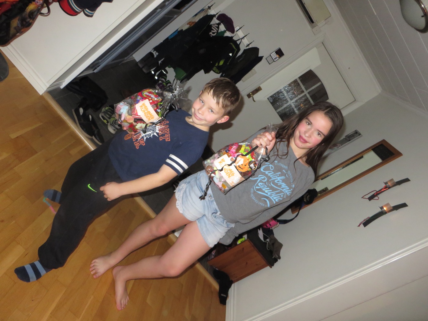 I går firades Halloween så det stod härliga till här hemma. Barnen klädde ut sig till skelett och Anabelle och tillsammans gick de ut i området och körde Bus eller Godis. De fick en hel del med sig hem i korgen.