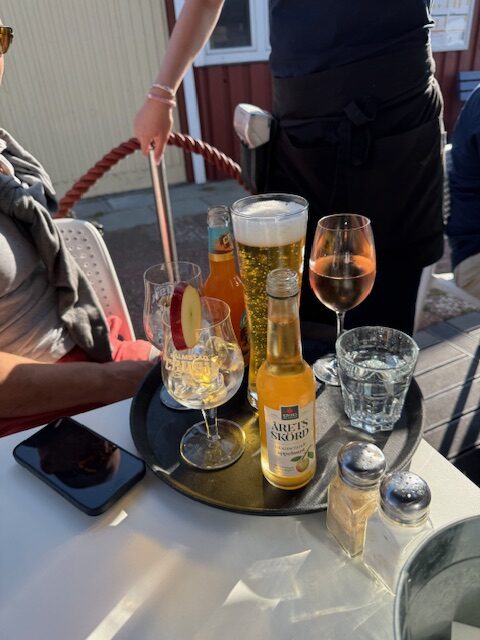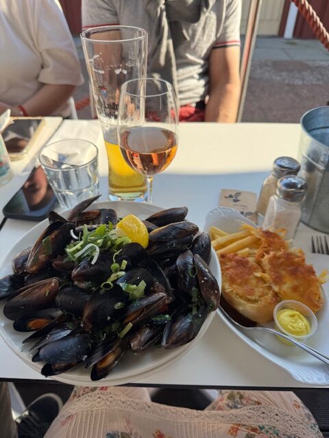 På kvällen piffade vi till oss, tog chips och drink vid husbilen och gick sedan in till Torekov. Först strosade vi runt i hamnen och sedan satte vi oss på uteserveringen på restaurang Fiskhuset där vi åt fantastisk mat och dryck. Jag tog en Moules Marinière med vitlöksbröd och pommes. Servitören övertalade mig att ta en hel, men oh my… Skulle tagit en halv. Det var enormt berg med musslor. Men gott var det! Barnen tog Fish&chips och Mattias Havets Wallenbergare. Någon efterrätt gick inte ner i någons mage.