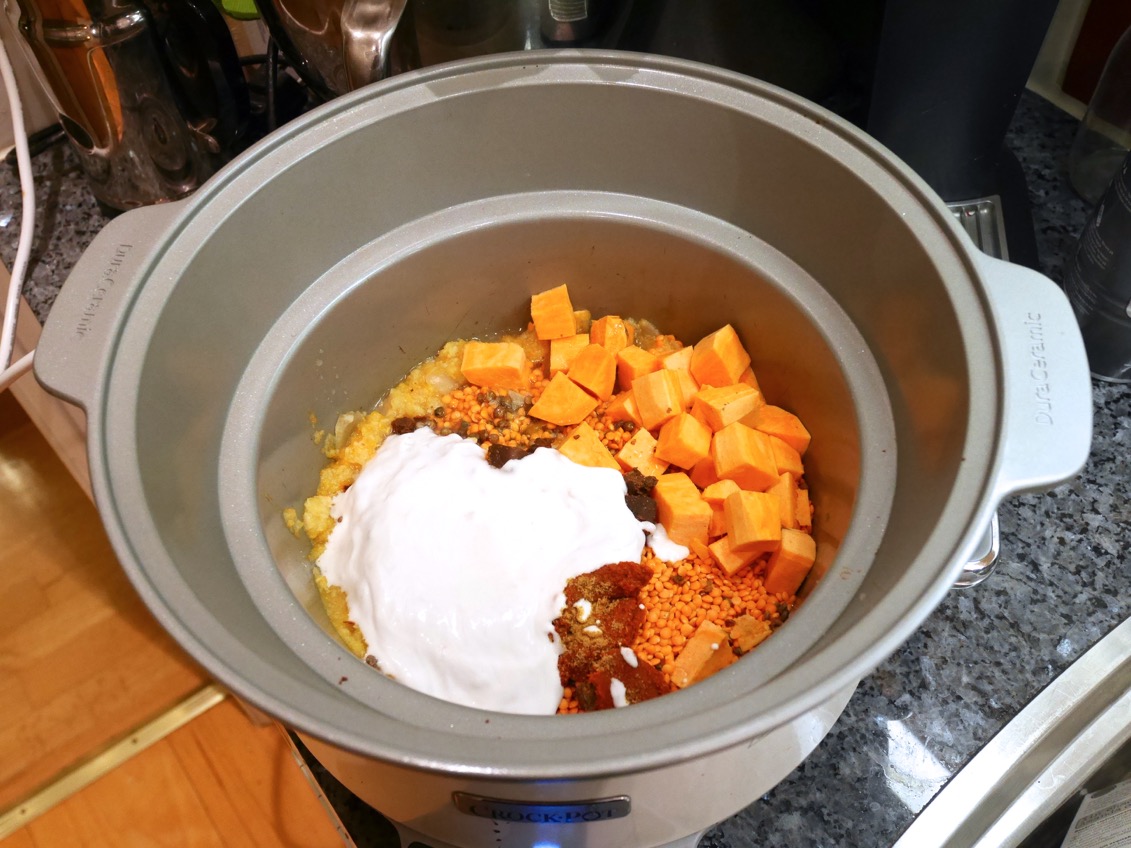 Hacka lök, vitlök , morot och palsternacka grovt. Lägg i Crock Pot. Häll på vatten så att det täcker grönsakerna, ca 1 1/2 dl. Kör på hög värme i 1.5 timmar. Mixa grovt med stavmixer. Lägg i röda och gröna linser, broccoli samt sötpotatis. Tillsätt buljong, röd currypasta, ingefära samt alla kryddor. Häll på kokosmjölk och stäng locket. Låt gå 2.5-3 timmar på låg. Fyll eventuellt på med vatten under tiden. Smaka av grytan med mer kryddor efter smak. Toppa med nystekt, tärnad halloumi. Servera grytan med kokt basmatiris.